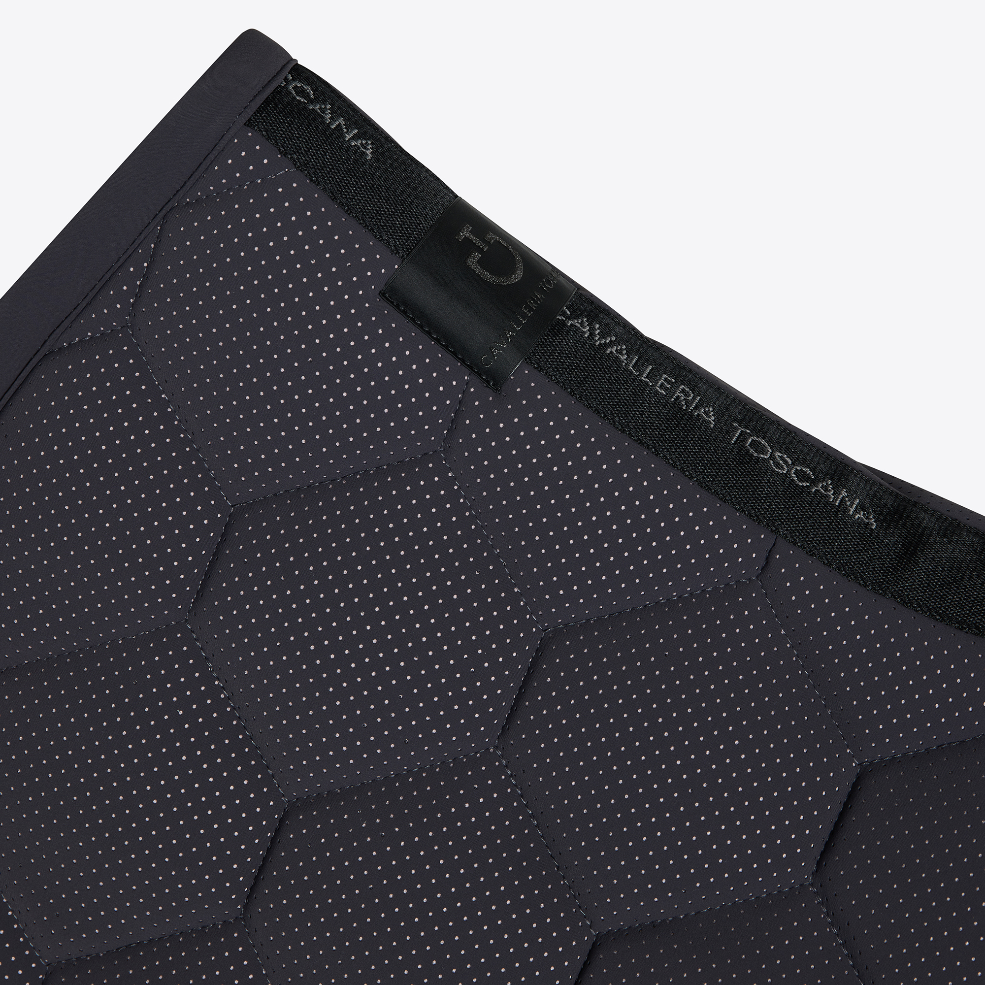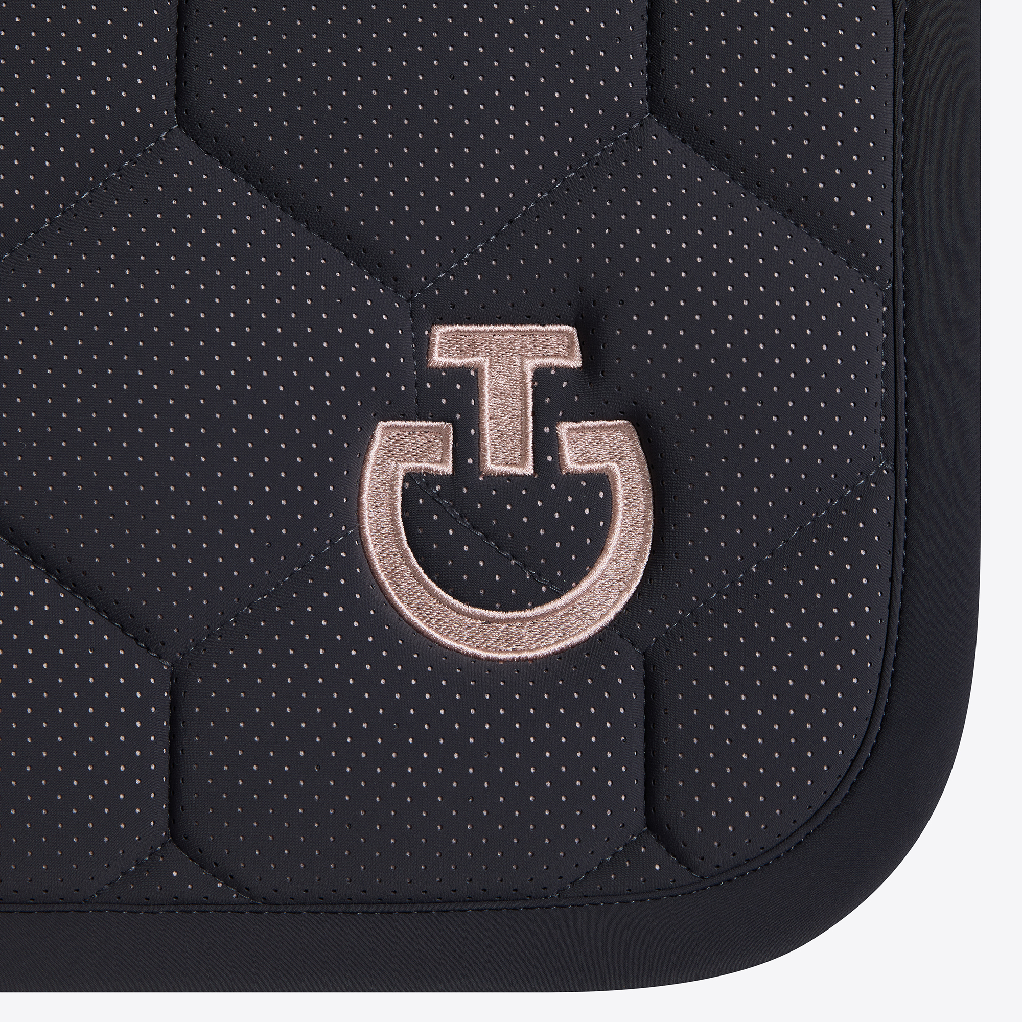 Die Cavalleria Toscana Springschabracke kombiniert technisches Know-how mit elegantem Design für Springpferde. Die Honeycomb-Padding-Füllung verteilt den Druck gleichmäßig und sorgt für Stabilität, während atmungsaktive Materialien den Komfort maximieren. Die Steppung und Paspelierung verleihen der Schabracke eine edle Optik, ergänzt durch das gestickte CT-Logo. Waschbar bei 30 °C im Schonwaschgang.