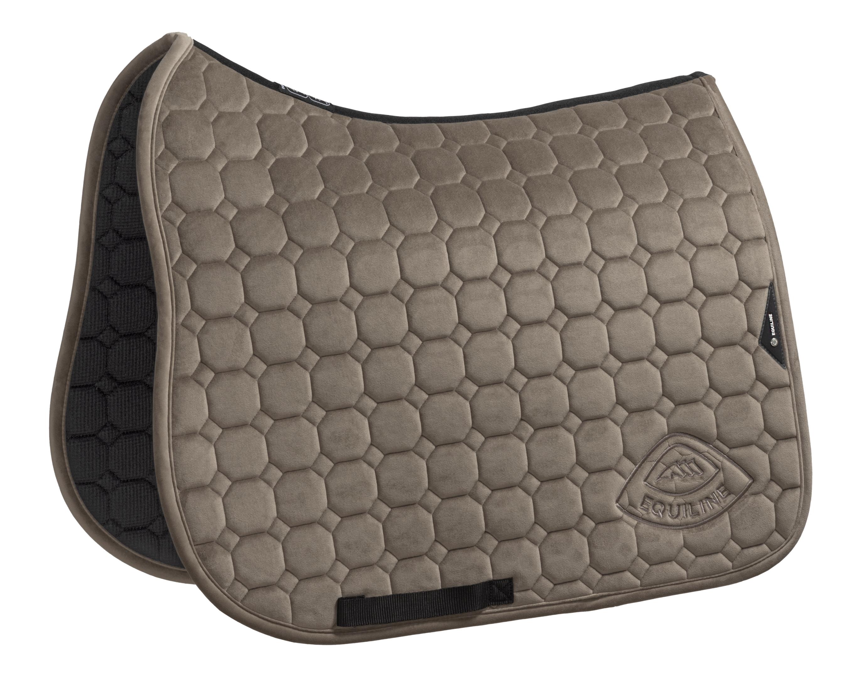 Die Equiline Samtschabracke Arog Dressur in Beige vereint edles Design mit technischer Perfektion. Der hochwertige Samtstoff mit Octagon-Steppung verleiht der Schabracke einen luxuriösen Look, während die 900g starke, antibakterielle Polsterung für eine effektive Stoßdämpfung und gleichmäßige Druckverteilung sorgt – optimaler Schutz für den empfindlichen Pferderücken.