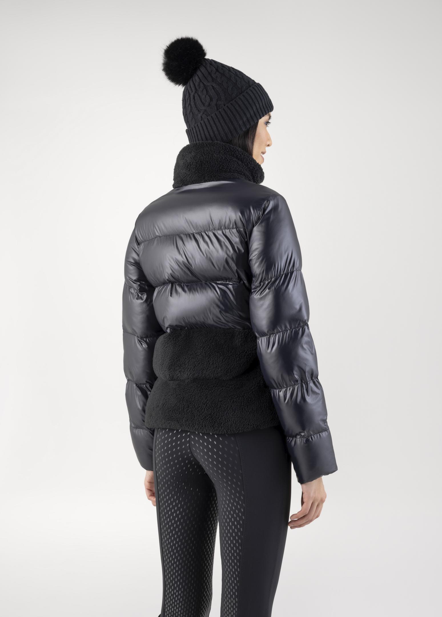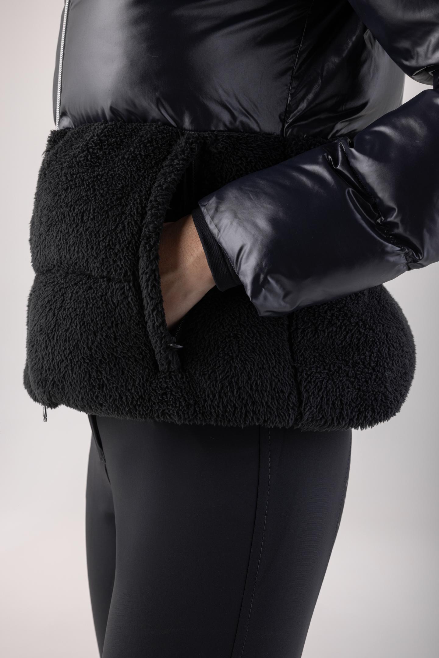 Die Equiline Geddy Damen-Winterjacke kombiniert elegante Optik mit maximalem Komfort – ideal für kalte Wintertage. Das schwarze Design wird durch den stylischen Teddyfell-Einsatz am Kragen und im unteren Oberkörperbereich zu einem echten Blickfang.