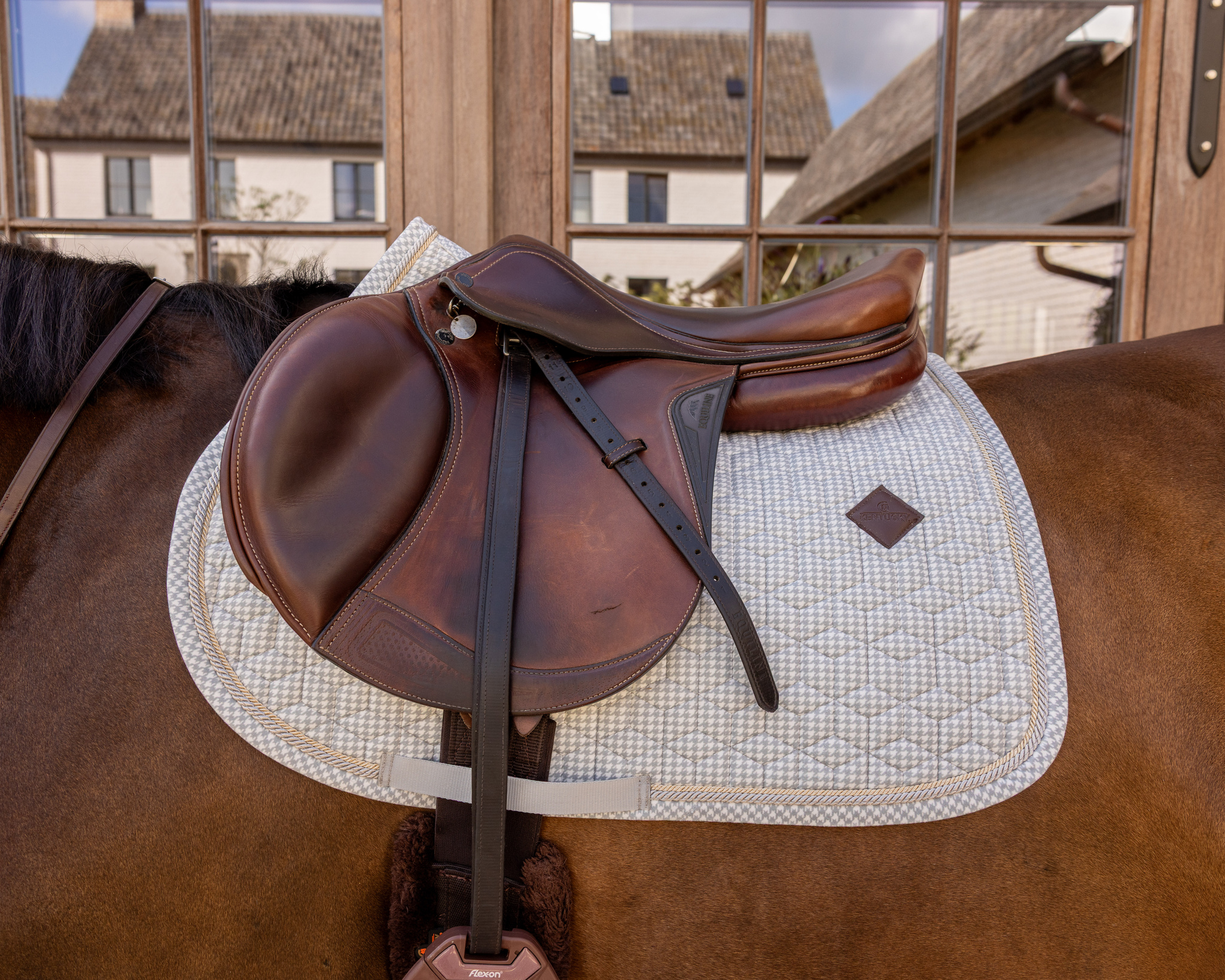 Die anatomische Passform gewährleistet eine ideale Sattellage – ganz ohne störende Riemen oder überflüssige Befestigungen. Erhältlich in Dressur- und Springform, lässt sie sich perfekt an Reitdisziplin und Stil anpassen. Für ein harmonisches Gesamtbild gibt es die passende Fliegenhaube (Ref. 42637) im selben Design.
