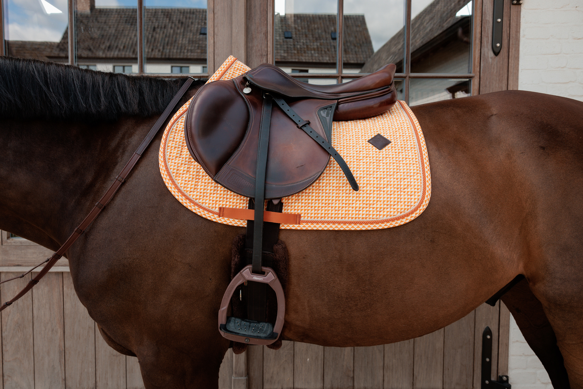Die anatomische Passform gewährleistet eine ideale Sattellage – ganz ohne störende Riemen oder überflüssige Befestigungen. Erhältlich in Dressur- und Springform, lässt sie sich perfekt an Reitdisziplin und Stil anpassen. Für ein harmonisches Gesamtbild gibt es die passende Fliegenhaube (Ref. 42637) im selben Design.
