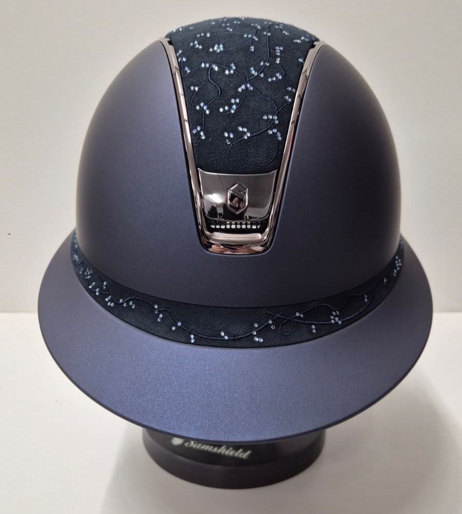 Der Samshield Miss Shield Shadowmatt 2.0 in Navy mit exklusiver Crystal Leaf Konfiguration am Top und Frontalband ist die perfekte Kombination aus Sicherheit, Komfort und luxuriösem Design. Mit seiner eleganten matten Oberfläche und den schimmernden Kristallen in Blattform setzt dieser Reithelm ein unverwechselbares Statement – sowohl im Training als auch auf dem Turnier.